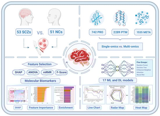 To fill this gap, this study employs an AI-driven multi-omics framework to systematically analyze plasma proteomics, post-translational modifications (PTMs), and untargeted metabolomics data from SCZ patients and non-psychiatric comparison (NC) subjects. Utilizing 17 machine learning models, we constructed classification models and identified key molecular features associated with SCZ. Our results demonstrate that multi-omics integration significantly enhances classification performance, surpassing single-omics approaches in distinguishing SCZ patients from healthy individuals. Notably, our analysis emphasizes immune system dysregulation and coagulation abnormalities as central molecular hallmarks of SCZ. These findings remained consistent across multiple feature selection methods, including Shapley Additive Explanations (SHAPs), Analysis of Variance (ANOVA), Fisher Score (F-score), and Minimum Redundancy Maximum Relevance (mRMR), underscoring their robustness and potential clinical relevance. Taken together, this study not only advances our understanding of the molecular basis of SCZ but also establishes a scalable framework for integrating multi-omics data into psychiatric research. Our findings lay the foundation for future investigations exploring multi-omics biomarkers for early diagnosis, patient stratification, and personalized treatment strategies for SCZ (Figure 1).