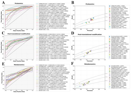 Performance evaluation of single-omics classifiers for SCZ using machine learning and deep learning models. (A,C,E) ROC curves for proteomics, PTMs, and metabolomics based on 17 algorithms, respectively. (B,D,F) PR curves for proteomics, PTMs, and metabolomics based on 17 algorithms, respectively.