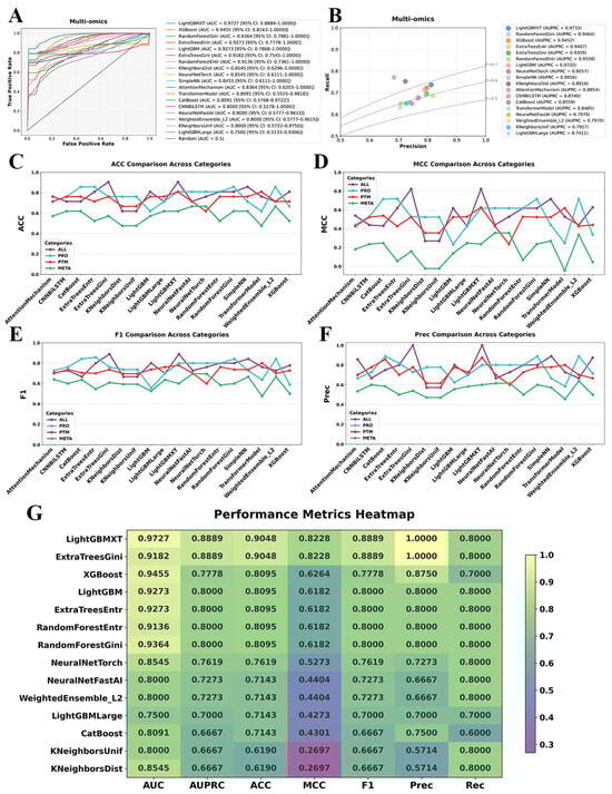 Figure 3G further consolidates the performance metrics of multi-omics models through a comprehensive heatmap, intuitively summarizing their comparative effectiveness across key indicators, including AUC, AUPRC, ACC, MCC, F1, Prec, and Rec. The heatmap reveals that gradient boosting methods, particularly LightGBMXT, consistently outperformed most other models in AUC and Prec, underscoring its robustness when applied to multi-omics datasets. This observation suggests that gradient boosting techniques are particularly effective in handling the high-dimensional and heterogeneous nature of integrated omics data for binary classification tasks.