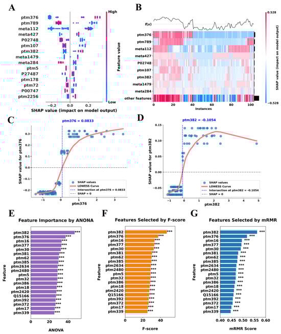 Evaluation and comparison of feature selection across multi-omics approaches using SHAP, ANOVA, F-score, and mRMR. (A) A visualization of the impact of different features on the model output, ordered by the magnitude of their SHAP values. The plot illustrates the direction and magnitude of each feature’s impact on the model output, with positive SHAP values indicating an increase in the model’s prediction and negative values indicating a decrease. (B) The heatmap depicting the distribution of SHAP values across 100 instances, highlighting the correlation between feature values and their effect on the model’s output. (C,D) SHAP dependence plots for selected features, ptm376 (C) and ptm382 (D), demonstrating the relationship between feature values and SHAP values, with intersection points marking significant thresholds for model impact. (E–G) Feature importance determined by different selection methods: (E) ANOVA, (F) F-score, and (G) mRMR scores. Features are ranked based on their importance, with statistical significance indicated by asterisks. *** p < 0.001.
