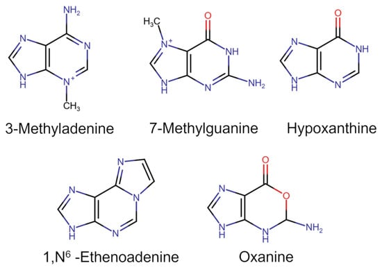 - Lee, C.Y.I.; Delaney, J.C.; Kartalou, M.; Lingaraju, G.M.; Maor-Shoshani, A.; Essigmann, J.M.; Samson, L.D. Recognition and Processing of a New Repertoire of DNA Substrates by Human 3-Methyladenine DNA Glycosylase (AAG). Biochemistry 2009, 48, 1850–1861. [Google Scholar] [CrossRef] [PubMed]