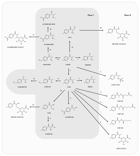 - Linhart, I.; Himl, M.; Židková, M.; Balíková, M.; Lhotková, E.; Páleníček, T. Metabolic profile of mephedrone: Identification of nor-mephedrone conjugates with dicarboxylic acids as a new type of xenobiotic phase II metabolites. Toxicol. Lett. 2016, 240, 114–121. [Google Scholar] [CrossRef] [PubMed]