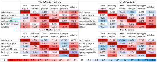 The Pearson correlation coefficients between the tested parameters in the perianth and corona of ‘Dutch Master’ and ‘Mando’ daffodils were also examined (Figure 1). The analysis showed multiple relationships with different strengths between the contents of total sugars, reducing sugars, free proline, malondialdehyde, hydrogen peroxide, and catalase activity.