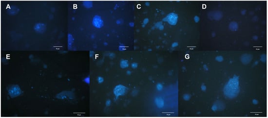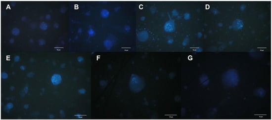 For observations of nuclear morphology and chromatin condensation, nuclei from the perianth or coronas of cut ‘Dutch Master’ daffodil flowers were isolated according to the methods of Galbraith et al. []. Isolated nuclei were stained with 4′,6-diamidine-2′-phenylindole dihydrochloride (DAPI; Sigma-Aldrich, St. Louis, MO, USA) by a 5 min pretreatment with 0.2 mol dm−3 citric acid and a 30 min incubation with DAPI (2 mg·dm−3) in PBS, pH 7.4. DAPI staining is used to visualize cell nuclei by binding strongly to DNA. The protocol involves fixing and permeabilizing cells to allow DAPI to enter and bind DNA, enabling fluorescent detection under UV light. The microphotographs used to visualize the morphological changes in the nuclei and nuclear chromatin were obtained with an AX Provis fluorescence microscope (Olympus, Tokyo, Japan) with Quick Photo Pro software Version 3.0.