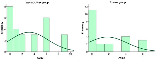 We performed a statistical analysis of the frequency distribution of the ACE2 immunoreactivity scores in the placental tissue of SARS-CoV-2+ patients and the control group. The results are shown graphically in