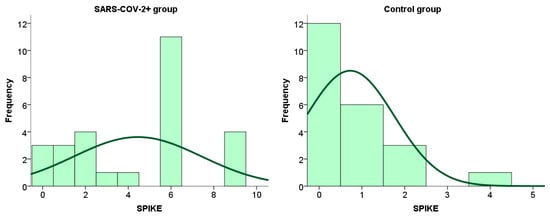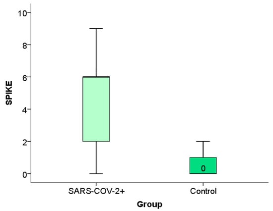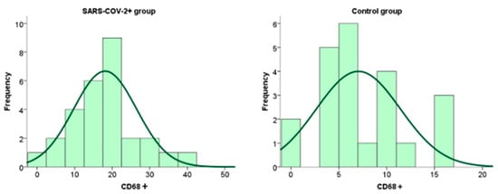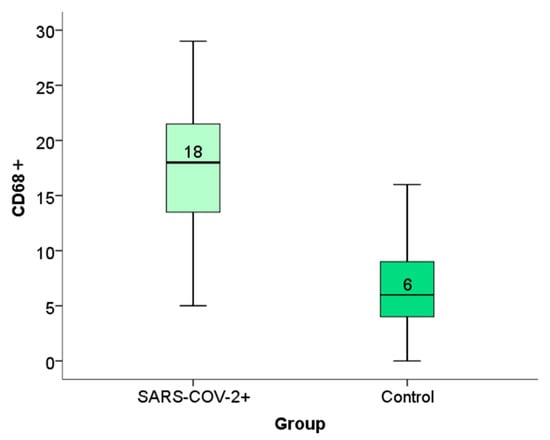 Based on the results of the Man–Whitney test, we observed a statistically significant difference in the expression of spike proteins and CD68+ macrophages between the SARS-CoV-2+ group and the control group. (