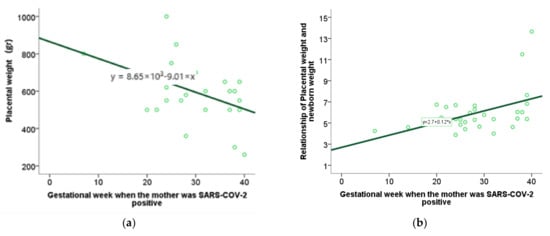 For the analysis of numerical variables related to the gestational week in which the infection occurred, the method of correlation and regression was applied. Specifically, the value of the Spearman correlation coefficient was interpreted, and a scatterplot was used to graphically represent the statistically significant results. By testing the characteristics of the perinatal outcome using the Spearman range correlation test with the moment at which SARS-CoV-2 infection occurred during pregnancy, we found an association between placental weight and the week of gestation in which the infection occurred, as well as a relationship between placental weight and newborn weight and week of gestation in which the infection occurred (