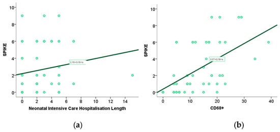. The correlation and regression methods were applied to the analysis of IHH numerical variables scores, i.e., the value of the Spearman correlation coefficient. A scatter diagram was used to visually present statistically significant results. Through the Spearman correlation test, we examined the association between the expression of spike proteins within the placental tissue of patients infected with SARS-CoV-2 and the expression of CD68+ macrophages and the expression of ACE2 receptors within the same tissue. We found a positive correlation between the expression of spike proteins and the expression of CD68+ macrophages (
