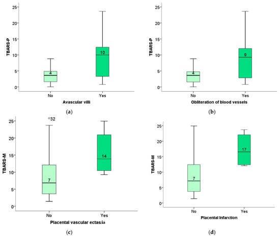 The level of TBARS of the newborn was significantly elevated in pregnant women with placental pathological findings of avascular villi (