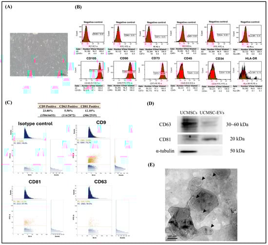 Characterization of UCMSCs and UCMSC-EVs. (A) Phase-contrast image of UCMSCs cultured on the plastic culture plate. Scale bar: 100 μm. (B) Representative histograms showing the expression of CD105, CD90, CD73, CD45, CD34, and HLA-DR on the surface of UCMSCs. Unstained cells were included as negative controls to validate the specificity of antibody staining. (C) Flow cytometry analysis to quantify the percentage of UCMSC-EVs positive for CD9, CD63, and CD81. (D) Western blot analysis of the protein expressions of CD63, CD81, and α-tubulin in UCMSCs and UCMSC-EVs. (E) Morphology of UCMSC-EVs (arrowhead), as observed using TEM.