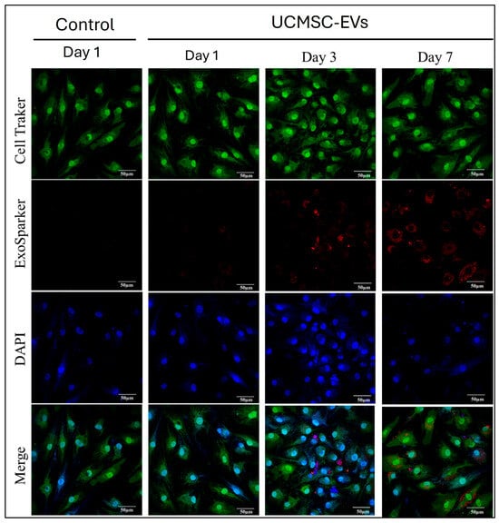 Red-fluorescence-labeled UCMSC-EVs (109 particles/mL) were incubated with chondrocytes for 7 days to evaluate cellular uptake. Red-fluorescence-labeled UCMSC-EVs were not detected within chondrocytes in either the Control or UCMSC-EVs group on day 1 (Figure 2). By day 3, labeled vesicles were internalized by chondrocytes in the UCMSC-EVs group, with fluorescence signals observed in the cytoplasm and perinuclear regions (Figure 2). On day 7, a more pronounced uptake was noted, indicating a time-dependent internalization of UCMSC-EVs by chondrocytes. These findings demonstrate that chondrocytic uptake of UCMSC-EVs began after three days of incubation.