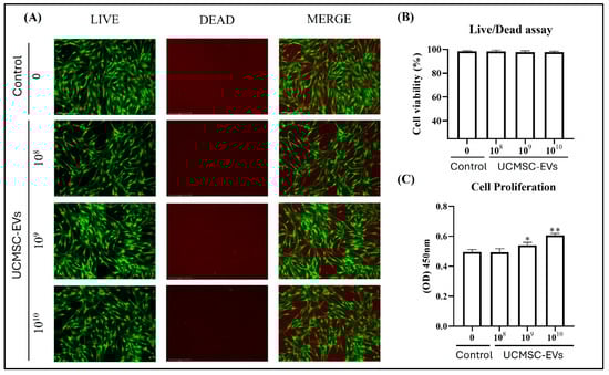 Effect of UCMSC-EVs on survival and proliferation of chondrocytes. Chondrocytes were treated with UCMSC-EVs at concentrations of 0 (Control group) or 108–1010 particles/mL (UCMSC-EVs group) for 7 days. (A) Live/dead cell staining was performed on day 7 to assess cell viability. Live cells were labeled with calcein-AM (green), while dead cells were stained with ethidium homodimer-1 (red). Green fluorescence indicated viable cells, and red fluorescence indicated non-viable cells. Chondrocytes remained viable following UCMSC-EVs treatment. (B) Quantitative analysis of cell survival revealed no detectable cell death after UCMSC-EVs exposure. (C) Chondrocyte proliferation was evaluated using an MTS assay on day 7. UCMSC-EVs significantly promoted chondrocyte proliferation, especially at concentrations of 109 and 1010 particles/mL. Data are expressed as mean ± SEM (n = 6). * p < 0.05, ** p < 0.01 vs. Control group.
