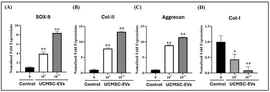 Effect of UCMSC-EVs on mRNA expression of chondrogenic genes (SOX-9, Col-II, and Aggrecan) and fibrocartilaginous gene (Col-I) of chondrocytes. Chondrocytes were cultured for 7 days with UCMSC-EVs at concentrations of 0 (Control group) or 1 × 109 to 1 × 1010 particles/mL (UCMSC-EVs group). On day 7, mRNA expression levels of chondrogenic markers ((A) SOX-9, (B) Col-II, (C) Aggrecan) and the fibrocartilaginous marker ((D) Col-I) were analyzed. Total RNA was isolated and subjected to real-time polymerase chain reaction analysis. Gene expression levels are presented relative to the Control group, which is normalized to 1. Data are expressed as mean ± standard error of the mean (SEM; n = 4). * p < 0.05 and ** p < 0.01 for comparisons with the Control group.