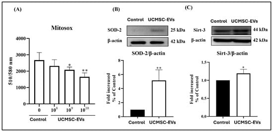 We further test whether UCMSC-EVs influence the mitochondrial superoxide production and the protein levels of SOD-2 and Sirt-3 of chondrocytes. After UCMSC-EVs treatment, the level of mitochondrial superoxide production in chondrocytes was decreased (Figure 5A). In comparison to that in the Control group, the mitochondrial superoxide production in chondrocytes was decreased in the UCMSC-EVs group (109–1010 particles/mL) (Figure 5A). We further confirmed the effect of UCMSC-EVs on the protein levels of SOD-2 and Sirt-3 in chondrocytes. We found that UCMSC-EVs also increased the protein levels of SOD-2 and Sirt-3 in chondrocytes. In comparison to that in the Control group, the expression of SOD-2 and Sirt 3 in chondrocytes was increased in the UCMSC-EV group (1010 particles/mL) (Figure 5B,C).