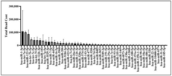 miRNA bioinformatics analysis of UCMSC-EVs. Small RNA sequencing was performed on three independent batches of UCMSC-EVs. The 50 most abundant known miRNAs identified in the UCMSC-EVs were ranked based on total read counts across all replicates (n = 3), as shown in the figure.