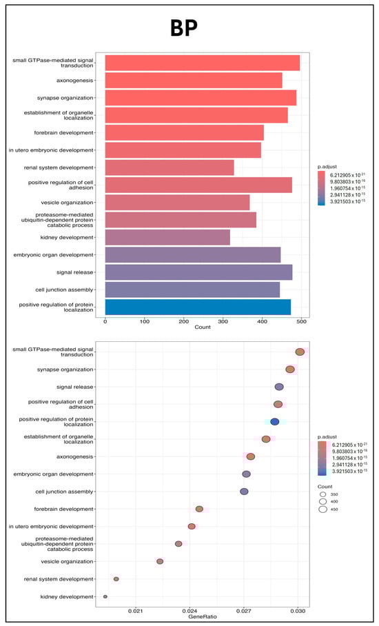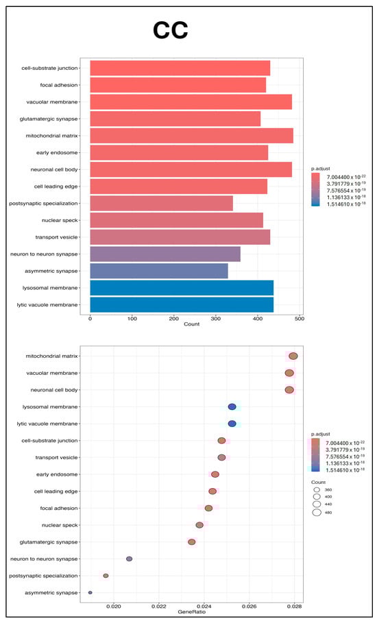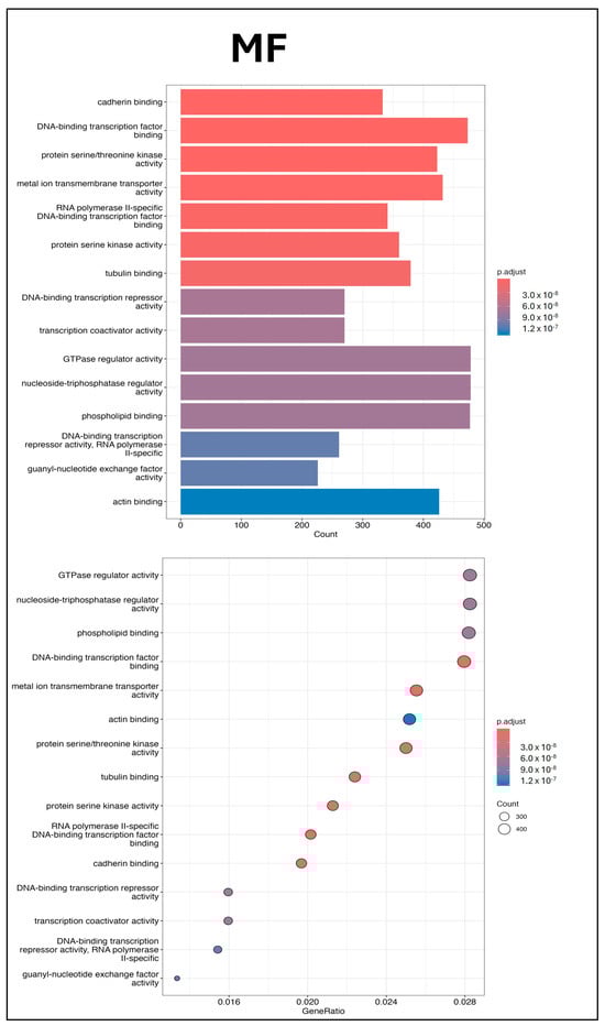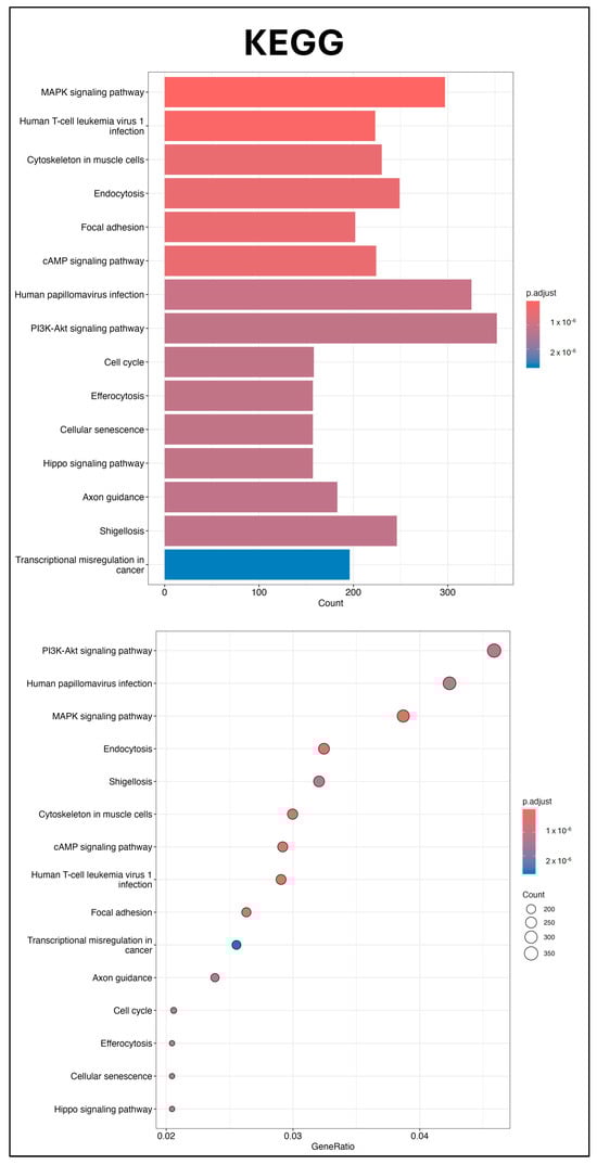 Raw sequencing reads were initially processed using CLIP Tool Kit (v1.0.3) to trim adapter sequences at the 3′ end, retaining 34 bp per read []. Reads within the insert size range of 15–30 bp, appropriate for mature miRNAs, were selected using Filter FASTQ (v1.1.5) []. Filtered reads were aligned to the human miRNA reference (miRBase v22.1) using BWA (v0.7.17.4) [], and mapping results were assembled and quantified via standard Linux commands. Normalization and differential expression analyses were conducted using edgeR (v3.32.1) [], identifying miRNAs and genes with log2-fold changes >1 or <−1 and a significance threshold of p < 0.05.