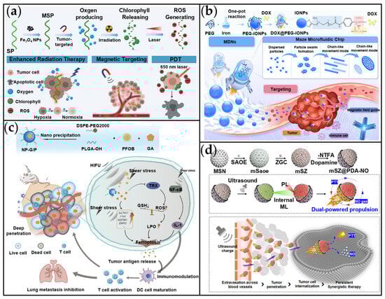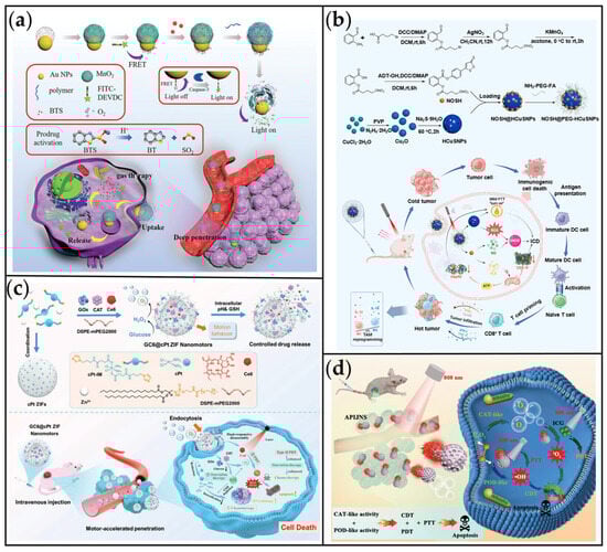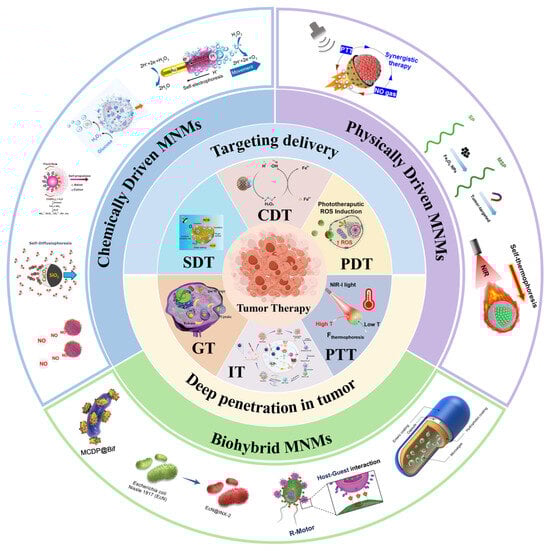 Comprehensive and detailed reviews already exist summarizing the development, preparation, propulsion mechanisms, and biological applications of MNMs [,,]. While some of these include coverage related to cancer treatment [], detailed reviews specifically on the synergistic treatment of cancer using MNMs combined with other therapies remain relatively scarce. To better advance the application of MNMs in cancer therapy, this review focuses on MNM-mediated therapeutic applications in cancer treatment, comprehensively examining their underlying mechanisms. We systematically introduce three key aspects: (1) movement mechanisms of MNMs for cancer therapy; (2) tumor-targeting and penetration capabilities of MNMs; (3) synergistic effects of combining MNMs with other therapies to enhance anti-tumor efficacy, including chemodynamic therapy (CDT), sonodynamic therapy (SDT), photothermal therapy (PTT), chemotherapy (CT), photodynamic therapy (PDT), immunotherapy (IT), and gas therapy (GT) (Figure 1).