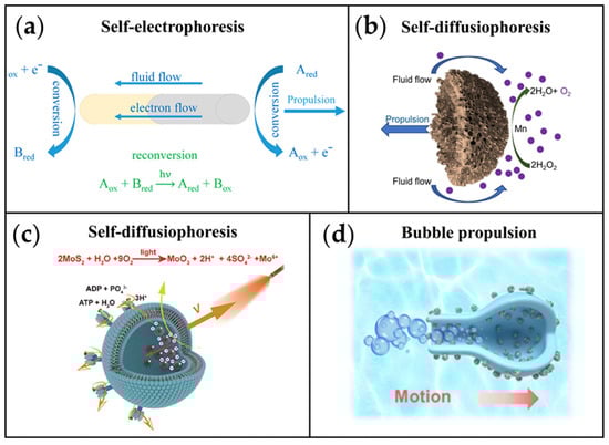 Schematic illustrations of chemically driven MNMs propulsion mechanisms: (a) Self-electrophoretic motion (reproduced from [] with permission from the American Chemical Society). (b) H2O2-based self-diffusiophoretic propulsion (reproduced from [] with permission from Elsevier). (c) Photo-triggered self-diffusiophoretic propulsion (reproduced from [] with permission from John Wiley and Sons). (d) Bubble-propelled motion (reproduced from [] with permission from the American Chemical Society).