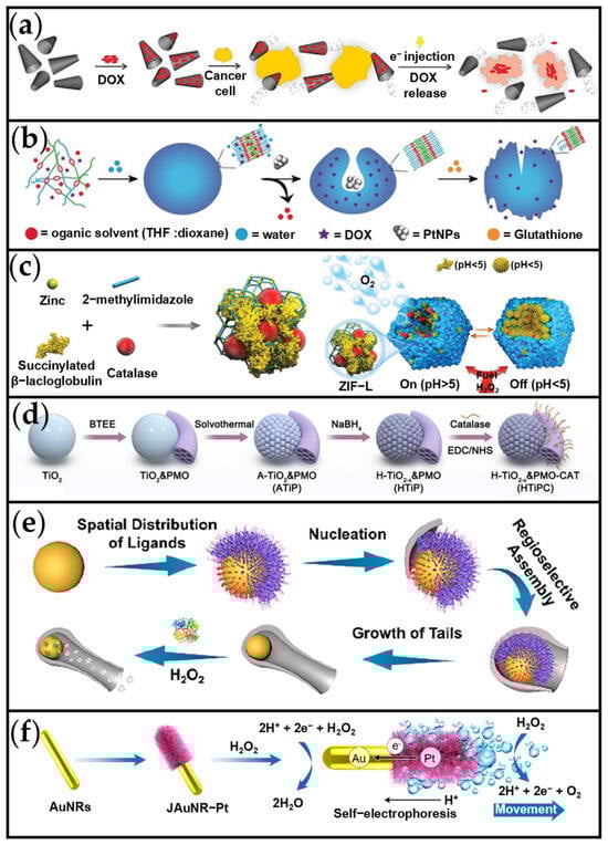 H2O2-dependent MNMs. (a) Schematic illustration of DOX loading and release on/from the n-rGO/Pt micromotors (reproduced from [] with permission from John Wiley and Sons). (b) Self-assembly and GSH-triggered disassembly of the redox-sensitive stomatocyte nanomotor (reproduced from [] with permission from John Wiley and Sons). (c) Schematic representation of micromotor assembly with pH-responsive on/off motion (reproduced from [] with permission from John Wiley and Sons). (d) Schematic representation of HTiPC micromotor assembly (reproduced from [] with permission from the American Chemical Society). (e) Schematic illustration of AHOAST superassembly and self-propulsion mechanisms (reproduced from [] with permission from the American Chemical Society). (f) Schematic illustration of the synthesis pathway for the JAuNR-Pt nanomotor and the rapid self-propulsion of AuNRs toward the Pt side via self-electrophoresis (reproduced from [] with permission from the American Chemical Society).