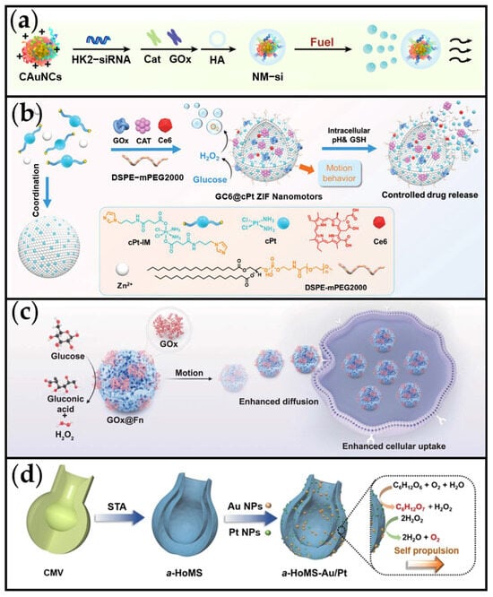 Mano et al. pioneered the first demonstration of an artificial system driven by GOx in conjunction with bilirubin oxidase (BOD) []. Subsequently, MNMs utilizing GOx/CAT emerged, including motors with potential for cancer treatment. Yu et al. developed a glucose-dependent nanomotor (NM-si) designed to enhance drug penetration and therapeutic efficacy within the TME (Figure 4a) []. This self-propelled NM-si was constructed by co-adsorbing GOx and CAT onto positively charged Au nanoclusters. Within the system, GOx catalyzes the oxidation of intratumoral glucose, producing gluconic acid and H2O2. In the subsequent step, CAT decomposes the H2O2 into O2. This sequential enzymatic reaction drives the continuous generation of O2 bubbles, enabling the MNMs to achieve self-propulsion at a velocity of 25.25 ± 0.33 µm/s. In addition, as shown in Figure 4b, we developed a prodrug system based on cisplatin-skeletal zeolitic imidazolate frameworks (GC6@cPt ZIFs), propelled via bubble generation. This system achieved a drug loading efficiency of 13.52% []. The nanomotors integrated GOx, CAT, and the photosensitizer chlorin e6 (Ce6) within the ZIF, enabling self-propulsion through an enzymatic cascade that converts glucose and endogenous H2O2 into O2 bubbles. With an average size of 100 nm, GC6@cPt ZIFs reached a maximum speed of 2 μm/s in 10 mM glucose solution and maintained 1.4 μm/s in 5 mM glucose solution. This rapid mobility enhanced tumor accumulation following intravenous administration. Upon reaching tumor cells, the cPt ZIF framework disintegrated in response to the acidic tumor microenvironment (pH 6.5–6.9) and reductive glutathione (GSH), releasing both chemotherapeutic cPt and co-loaded cargoes. Beyond the dual-enzyme cascade system, GOx alone can propel the motor via self-diffusiophoresis. Xu et al. developed a self-propelled nanomotor (GOx@Fn) comprising GOx and ferritin (Fn) to enhance tumor therapy through ferroptosis mechanisms (Figure 4c) []. In this system, GOx catalyzes glucose decomposition into gluconic acid and H2O2, driving enhanced diffusion of the nanomotor. However, this approach exhibits limited motion performance, achieving an average speed of only 4.27 µm/s even in a high-concentration glucose solution (400 mM).
