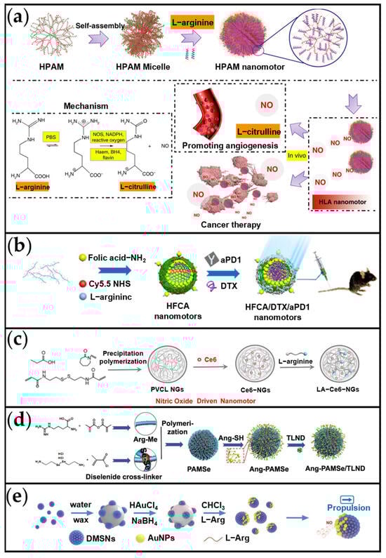 Nitric oxide (NO) is a pleiotropic regulator playing critical roles in diverse biological processes, including vasodilation, neurotransmission, anti-inflammation, and immune defense [,]. Significantly, studies demonstrate that within the tumor microenvironment (TME), NO reacts with superoxide anions (O2•−) to form peroxynitrite (ONOO−), which induces the activation of matrix metalloproteinases (MMPs) in the tumor stroma [,]. MMPs can degrade nearly all collagen components in the extracellular matrix (ECM), thereby enhancing the penetration of therapeutic drugs into the tumor site [,]. Furthermore, high concentrations of NO have been shown to mediate cancer cell apoptosis and inhibit tumor growth []. Consequently, NO has emerged as a promising molecule for GT []. The primary physiological NO production pathways involve the NOS-catalyzed conversion of arginine to NO or the reaction of ROS with arginine to generate NO [,]. Given that NOS and ROS concentrations in the TME are substantially higher than in normal cells [], MNMs containing arginine demonstrate enhanced propulsive mobility specifically within the TME. This nanobubble-based propulsion actuation strategy represents the predominant approach for developing NO-driven nanomotors [,,,,].