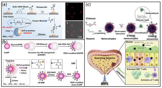 Tang et al. developed a urease-driven Janus micromotor (JPL-motor) to enhance targeted drug delivery (Figure 6a) []. Utilizing a polylysine surface-binding strategy to asymmetrically immobilize urease on natural platelets, the JPL-motor achieved self-propulsion via urea decomposition. This decomposition generated gradients of NH3 and CO2, enabling chemotactic motion in various biofluids (PBS, serum, cell medium) at speeds 1.62 times faster than their non-Janus counterparts. In vitro experiments demonstrated that JPL-motors loaded with the anticancer drug DOX bound to MDA-MB-231 cells (Human breast cancer cells) more rapidly: within 10 min, their associated fluorescence intensity increased 2.55-fold compared to passive systems. Moreover, these active JPL-motors reduced MDA-MB-231 cell viability to 40%, a significant enhancement over the 70% viability observed with passive systems. This platform eliminates reliance on external energy sources and toxic fuels, offering a versatile and innovative strategy for active drug delivery with promising applications in cancer therapy. Since nanoparticle accumulation in tumors is optimal within the 30–200 nm size range [], overcoming biological barriers necessitates miniaturization. To achieve autonomous motion within the bloodstream, Yang et al. developed ultrasmall enzyme-powered Janus nanomotors (UPJNMs) (Figure 6b) []. Using a scalable colloidal chemistry approach, they asymmetrically functionalized Janus-type Au-polystyrene nanoparticles (30–100 nm in size), coating one hemisphere with PEG brushes and immobilizing urease on the other. Urease enzymatically catalyzed the decomposition of urea into NH4+ and CO32− ions, establishing an ion gradient that propelled the nanomotor via self-diffusion electrophoresis. Significantly, the UPJNMs exhibited sustained mobility at physiological urea concentrations (5–10 mM) and displayed remarkable ionic tolerance in complex biological fluids (e.g., PBS, serum). These properties were attributed to their ultrasmall dimensions and protective PEG surface modification.