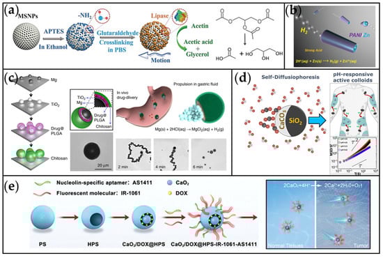 Other chemically driven MNMs. (a) Schematic representation of the functionalization strategy for preparing lipase-based nanomotors (reproduced from [] with permission from John Wiley and Sons). (b) Schematic of motion in an acidic environment (reproduced from [] with permission from Journal of the American Chemical Society). (c) Schematic preparation of Mg-based micromotors and in vivo propulsion and drug delivery in a mouse stomach (reproduced from [] with permission from Springer Nature). (d) pH-responsive Janus CaCO3 micromotors (reproduced from [] with permission from Journal of the American Chemical Society). (e) Schematic illustration of the sequential synthesis of CaO2/DOX and degradation of CaO2 (reproduced from [] with permission from John Wiley and Sons).
