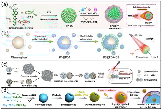 Light-driven MNMs, which utilize specific wavelengths of light for motion control, are particularly well-suited for photoresponsive actuation within biological systems []. Near-infrared light (NIR) is especially advantageous due to its exceptional biocompatibility and deep tissue penetration capabilities [], making it an optimal stimulus for MNMs in cancer therapy []. The motion mechanism of NIR-driven MNMs primarily relies on the generation of a thermal gradient through photothermal effects; this gradient subsequently propels the MNMs via self-thermophoresis []. The successful development of these NIR-responsive MNMs provides new opportunities to enhance treatment precision and minimize off-target effects in cancer therapy. For cancer treatment applications, NIR-driven MNMs are predominantly fabricated using semiconducting polymers (SP) [,,,] polydopamine (PDA) [,,], and metal nanoparticles [,,], among other materials.