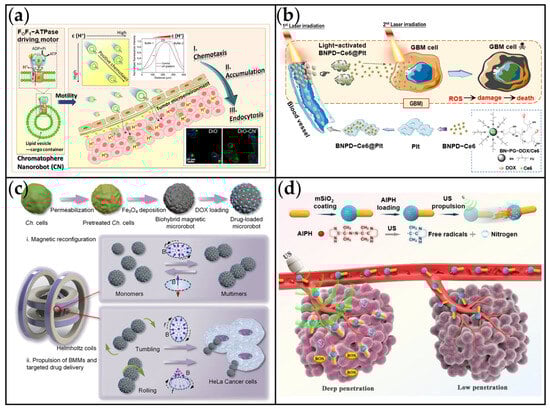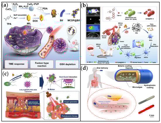 Biohybrid MNMs are primarily engineered by integrating live microorganisms with artificial materials [,]. These microorganism-powered MNMs harness the natural capabilities of microbes. For example, flagellated bacteria provide self-propulsion []. Additionally, anaerobic bacteria exhibit inherent tropism towards hypoxic tumor regions, making them valuable for targeted drug delivery []. As potent immune stimulators, bacteria can also activate the immune system, positioning bacteria-mediated tumor immunotherapy as a significant research focus []. Beyond bacteria, some algae offer advantages like phototaxis for targeted motion in tumor therapy, while the oxygen they generate via photosynthesis can alleviate tumor hypoxia [].