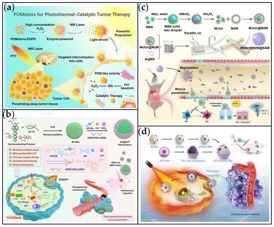 - Wang, H.; Gao, J.; Xu, C.; Jiang, Y.; Liu, M.; Qin, H.; Ye, Y.; Zhang, L.; Luo, W.; Chen, B.; et al. Light-Driven Biomimetic Nanomotors for Enhanced Photothermal Therapy. Small 2023, 20, e2306208. [Google Scholar] [CrossRef] [PubMed]