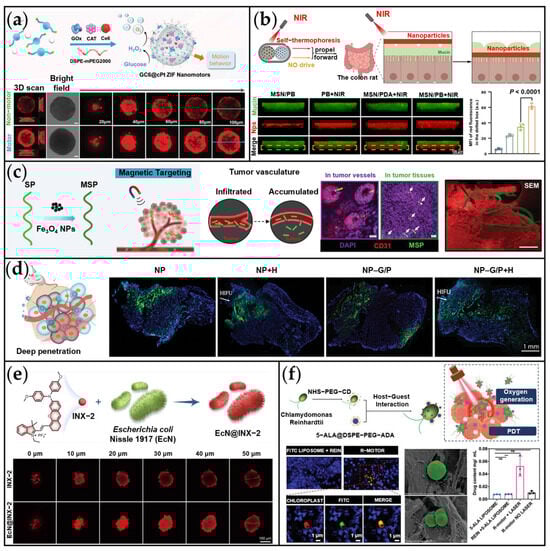 Tumor penetration of MNMs. (a) Schematic illustrating the self-propulsion mechanism of GC6@cPt ZIF nanomotors (up) and corresponding CLSM images showing their penetration into 3D multicellular tumor spheroids (MTSs) (down). Scale bar = 50 µm (reproduced from [] with permission from John Wiley and Sons). (b) Mechanism of MPBC movement direction under NIR irradiation (top) and CLSM images demonstrating nanoparticle penetration across the intestinal mucus barrier (bottom). Scale bar = 100 µm (reproduced from [] with permission from Springer Nature). (c) Schematic design of magnetic S. platensis-based microswimmers for tumor targeting (left) and their infiltration and accumulation mechanism within tumor tissue via tumor vasculature (right) (reproduced from [] with permission from John Wiley and Sons). (d) Immunofluorescence images of tumor sections depicting the accumulation and penetration profiles of nanomotors post-injection. Scale bar = 1 mm (reproduced from [] with permission from John Wiley and Sons). (e) CLSM images of EcN@INX-2 nanomotors and INX-2 penetrating CT26 tumor spheroids (reproduced from [] with permission from Springer Nature). (f) Mechanism of R-motor for targeted tumor accumulation, in situ oxygen generation, and subsequent PDT, C. reinhardtii labeled in green and liposomes labeled in red. Data were statistically analyzed using one-way ANOVA. *** p ≤ 0.001, n.s. non-significant. Scale bar = 1 μm. (reproduced from [] with permission from John Wiley and Sons).
