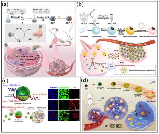 Ultrasound (US) offers significant advantages for biomedical applications, including its non-invasiveness, low cost, ease of operation, and strong deep-tissue penetration capabilities [,]. These properties enable US to enhance nanoparticle-mediated disruption of physiological barriers through mechanical effects, thereby facilitating drug delivery in cancer therapy []. Illustrating this, Ye et al. developed a US-propelled Janus Au nanorod-mesoporous silica (Au NR-mSiO2/AIPH) nanomotor for deep-tissue tumor theranostics (Figure 11d) []. Under US irradiation, the N2 donor (AIPH) decomposes to generate both N2 bubbles and free radicals. In vivo, the nanomotors accumulated in tumors under US guidance, achieving a tissue penetration depth of 1.32 mm and significantly enhancing PA/US imaging signals. This work establishes a US-activated strategy for precise tumor targeting and noninvasive treatment of deep-seated malignancies.