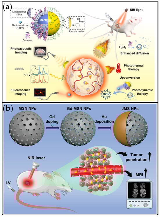 Cancer remains one of the most significant public health challenges of the 21st century, responsible for approximately 30.3% of global premature deaths from noncommunicable diseases among individuals aged 30–69 years []. Despite remarkable advances in medicine and biology, cancer incidence and mortality rates continue to rise. Conventional oncology treatments—including surgery, radiotherapy, and chemotherapy—have achieved notable successes and technological improvements, yet they inevitably cause significant side effects [,,,,,,,]. These limitations include the frequent delay in early cancer detection, which results in missed opportunities for timely intervention []. Surgical resection alone often fails to ensure complete tumor eradication, thereby increasing the risks of recurrence and metastasis [,,]. Prolonged use of chemotherapy drugs can lead to drug resistance in tumor cells and impose additional physical burdens on patients [,]. Targeted therapy requires precise identification of specific cancer cell mutations, limiting its wide applicability [,]. Furthermore, radiation therapy can induce significant damage to healthy tissues, resulting in considerable pain and suffering for patients []. Therefore, the development of precise early cancer diagnosis and effective tumor treatment strategies is crucial for cancer prevention and treatment.