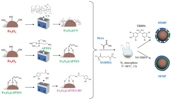 However, no studies comparing these two different magnetite surface coatings for the production of MIP systems for environmental applications have been reported in the literature. In addition, since the number of functional groups introduced by APTES is low and the interaction of the nanosystems with the template could be affected, in this study, APTES-functionalized MNPs were further modified by introducing 3,4-dihydroxyhydrocinnamic acid (HC), which can interact with the template through aromatic stacking interactions. The choice to bind an antioxidant to the MNPs was also dictated by the possibility of limiting the thickness of the polymeric shell during MIP formation by controlling the radical polymerization of MMA and EGDMA monomers. To this end, three different molar ratios between the amino groups on the MNP surfaces and the carboxylic groups of HC (1:0.3, 1:0.7, and 1:1.0) were used. To confirm the effectiveness of HC introduction and compare CS- and APTES-containing systems with each other, MNPs were subjected to preliminary TBBPA extraction measurements before MIP formation. After 24 h of contact with the flame retardant, the HC-containing systems showed higher binding capacity (Q = 0.08 mg/g) than the system functionalized with APTES (Q = 0.04 mg/g) and the CS-coated system (Q = 0.05 mg/g), confirming the efficacy of this strategy. Next, the MMIP systems were implemented by radical polymerization in the presence of the functionalized MNPs, using MAA and EGDMA as the functional monomer and cross-linking agent, respectively, and BPO as the initiator. Figure 1 shows the synthesis scheme of the developed systems.
