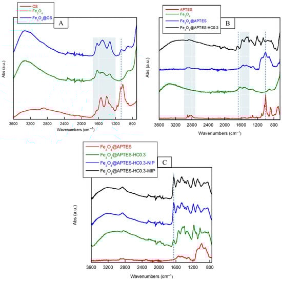 FTIR spectra of pristine chitosan (CS); pristine magnetite NPs (Fe3O4) and chitosan-coated MNPs (Fe3O4@CS) (A); FTIR spectra of pristine APTES, pristine magnetite NPs (Fe3O4), APTES-coated MNPs (Fe3O4@APTES), and NPs functionalized with APTES and then HC (molar ratio APTES:HC 1:0.3) (Fe3O4@APTES-HC0.3) (B); FTIR spectra of APTES-coated MNPs (Fe3O4@APTES), Fe3O4@APTES NPs functionalized with HC (molar ratio APTES:HC 1:0.3) (Fe3O4@APTES-HC0.3), and MMIP and MNIP systems obtained by in situ polymerization of MAA and EGDMA on Fe3O4@APTES-HC0.3 NPs (C).