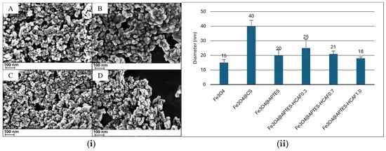 (i) SEM micrographs of obtained MNPs: Fe3O4 (A); Fe3O4@CS (B); Fe3O4@APTES (C); Fe3O4@APTES-HC0.3 (D). (ii) Diameter of prepared systems.