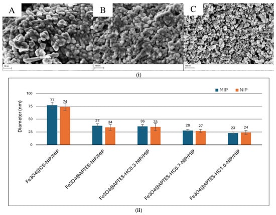 (i) SEM micrographs of the obtained MMIP and MNIP systems: MMIP-CS (A); MNIP-APTES (B); MMIP-APTES-HC1.0 (C). (ii) Diameter of prepared systems.