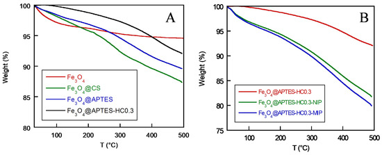 In addition to elemental analysis, the samples were subjected to thermogravimetric analysis, through which the presence of the coatings on the prepared samples could be further confirmed. The thermal stability of the nanosystems depends on the interactions that occur between the inorganic core and the surface organic coating layer. Therefore, the degradation of the organic part appears to be directly related to the functionalization of the surface [58]. The percent weight loss of the nanosystems and their degradation temperature (Td) are shown in Table 3, while thermograms of naked magnetite and after coating with CS, APTES, and APTES-HC0.3, the latter reported as an example, are shown in Figure 5A.