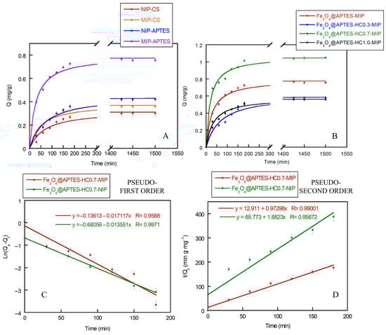 Adsorption kinetics of TBBPA on Fe3O4@CS-MIP/NIP and Fe3O4@APTES-MIP/NIP (A); adsorption kinetics of Fe3O4@APTES-MIP, Fe3O4@APTES-HC0.3-MIP, Fe3O4@APTES-HC0.7-MIP, and Fe3O4@APTES-HC1.0-MIP (B); Pseudo-first- (C) and pseudo-second- (D) order kinetics models for Fe3O4@APTES-HC0.7-MIP/NIP systems.
