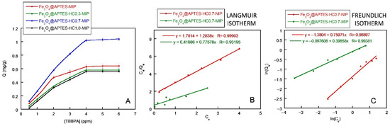 To investigate the interaction between the adsorbate and the sorbent, the equilibrium adsorption data were fitted with Langmuir and Freundlich equations. Figure 7B,C shows the fit of the isotherms of the Fe3O4@APTES-HC0.7-MIP/NIP sample, since this was the most promising system from the application point of view, while in Table 4 the values of the parameters obtained using the two models are reported.