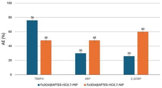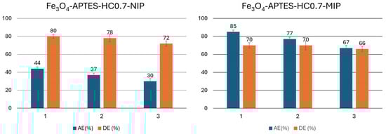 To enable the application of these systems in the environmental field, the evaluation of the reusability of the adsorbent is of fundamental importance [32,71]. Figure 9 shows the adsorption efficiency (AE%) and the desorption efficiency (DE%) of the Fe3O4@APTES-HC0.7-MIP/NIP system, chosen based on its high extraction capacities. From the obtained results, it could be stated that, after 24 h of contact with the analyte, the non-imprinted samples still had good extraction capacities, which, however, were lower than the imprinted analogs, confirming non-specific absorption of the analyte. The good desorption percentages observed in the first cycle of use allowed these systems to recharge the analyte, also allowing them to reach extraction efficiency values for the Fe3O4@APTES-HC0.7-MIP system of around 77% in the second cycle and around 67% in the third cycle. Since the washing steps were not able to completely remove the analyte, the subsequent reuse cycle was affected by the presence of the residual TBBPA, reducing the performance of the MIP and NIP systems.