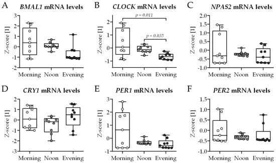 As described before, the expression of genes involved in the circadian rhythm core loop—BMAL1, CLOCK, NPAS2, and their negative feedback regulators CRY1, PER1, and PER2—was determined after 21 days of co-culture in the presence of HSPs obtained in the morning (7–8 am), noon (1–2 pm), or evening (7–8 pm). In contrast to the conventional co-culture, replacing the 2% FCS in the differentiation medium with 1% HSP resulted in an altered expression of the six genes. The expression of BMAL1 (Figure 7A), CLOCK (Figure 7B), and NPAS2 (Figure 7C) was highest in THP-1 cells and SCP-1 cells co-cultured in the presence of HSP obtained at noon, with significant difference to the co-cultures from the evening group. The expression of CRY1 was highest in the morning group, with significant difference to the evening group (Figure 7D). The inverse was observed for the expression of PER1 (Figure 7E) and PER2 (Figure 7F), which showed the highest expression in the evening group.
