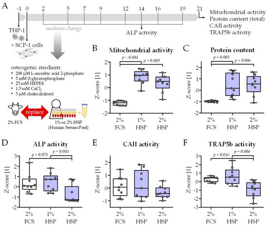 Functional testing of the modified medium composition. (A) Schematic overview of the experimental setup. THP-1 and SCP-1 cells were co-cultured in osteogenic differentiation medium containing 2% fetal calf serum (FCS) or 1% respective 2% human serum pool (HSP). For the HSP, equal volumes of human serum from 10 donors (N = 10) were pooled. On day 21 of culture, viability was assessed by (B) mitochondrial activity (resazurin conversion assay) and (C) total protein content (Sulforhodamin B staining). On day 14 of culture, (D) alkaline phosphatase (ALP) activity was measured photometrically as an early osteogenic marker. On day 21 of culture, (E) carbonic anhydrase II (CAII) and (F) tartrate-resistant acidic phosphatase (TRAP5b) activity were measured photometrically as an early and late osteoclast marker, respectively. All data were normalized as z-scores and are displayed as box plots with individual data points (N = 3, n = 3). Groups were compared with a non-parametric Kruskal–Wallis test followed by Dunn’s multiple comparison test whenever p < 0.05. All p-values below 0.1 are displayed in the graphics.