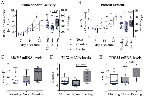 Highest cell proliferation in bone cell co-cultures differentiated in the presence of human serum collected in the evening. THP-1 and SCP-1 cells were co-cultured in osteogenic differentiation medium containing 1% human serum pools (N = 10) obtained in the morning (7–8 am), noon (1–2 pm), or evening (7–8 pm). Cell growth was assessed by changes in (A) mitochondrial activity (resazurin conversion assay) and (B) total protein content (Sulforhodamin B staining). Changes over time are displayed as line charts (median ± 95% CI of N = 4, n = 3) and summarized as the area under the curve (AUC). On day 21 of culture, total mRNA was collected in the morning and the expression of genes involved in the proliferation was investigated by qRT-PCR (ΔΔCt) and normalized as a z-score: (C) MIK67, (D) TPX2, and (E) TOP2A. Data are displayed as box plots with individual data points (N = 4, n ≥ 2) and the median. Groups were compared with a non-parametric Kruskal–Wallis test followed by Dunn’s multiple comparison test whenever p < 0.05. All p-values below 0.1 are displayed in the graphics.