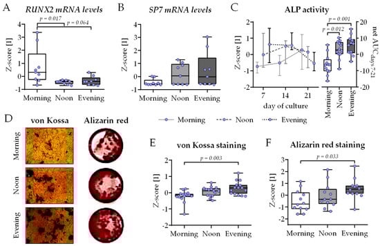 The same co-cultures were then analyzed for osteoblast function. On day 21 of co-culture, the expression of the two osteogenic key transcription factors RUNX2 and SP7 (encoding Osterix) was quantified by qRT-PCR. While the expression of the early osteoblast differentiation marker RUNX2 was highest in the morning group (with significant differences to the noon and evening group), the inverse was observed for the late osteoblast differentiation marker SP7, suggesting faster osteogenic differentiation in the noon and evening group (Figure 4A,B). In line with the qRT-PCR results, ALP activity showed a faster increase in the noon and evening group, which was significant over time when compared to the morning group (Figure 4C). Most of the mineralized matrix was formed in the evening group, as visualized (Figure 4D) and quantified by von Kossa (Figure 4E) and Alizarin Red (Figure 4F) staining, with significant difference to the morning group.