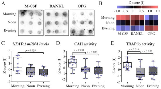 M-CSF, RANKL and OPG are key regulators of osteoclastogenesis that may show circadian variation in the serum. Therefore, their concentration was determined using a dot blot analysis with the three HSPs used for differentiation (Figure 5A). The quantification of the dot blot signals showed minimal, insignificant variation in the serum levels of M-CSF, RANKL, and OPG. The overall trend showed the highest serum levels of M-CSF and RANKL in the morning group. Inversely, OPG serum levels tend to increase with the time of day (Figure 5B). Taken together, this indicates that the presence of HSP obtained in the morning will favor osteoclastogenesis compared to HSP obtained at noon or in the evening. To investigate osteoclastogenesis, the expression of the key osteoclastic transcription factor NFATc1 was quantified by qRT-PCR. The expression of NFATc1 was highest in the morning group, with significant difference to the evening group (Figure 5C). In line with this, CAII and TRAP5b function were significantly higher in the morning group when compared to the noon or evening group (Figure 5D,E).