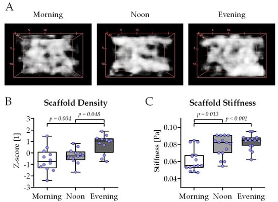 Highest scaffold density and stiffness with bone cell co-cultures differentiated in the presence of human serum collected in the evening. Three-dimensional co-cultures of THP-1 and SCP-1 cells were osteogenically differentiated with media containing 1% human serum pools (N = 10) obtained in the morning (7–8 am), noon (1–2 pm), or evening (7–8 pm). After 21 days of culture, mineral density of the scaffolds was determined by computer tomography. (A) Three-dimensional reconstructions of the cultured scaffolds representative for the morning, noon, and evening group. (B) The bone mineral density of the cultured scaffolds was quantified using the ImageJ 1.47v software. (C) Scaffold stiffness (E-modulus) was determined using a ZwickiLine Z 2.5TN material testing machine. All data were normalized as z-scores and are displayed as box plots with individual data points (N = 4 or 5, n = 3). Groups were compared with a non-parametric Kruskal–Wallis test followed by Dunn’s multiple comparison test whenever p < 0.05. All p-values below 0.1 are displayed in the graphics.