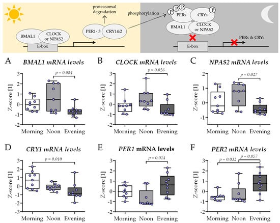 The expression of circadian clock genes in the newly established bone cell co-culture shows changes characteristic for the time of day. THP-1 and SCP-1 cells were co-cultured in osteogenic differentiation medium containing 1% human serum pools (N = 10) obtained in the morning (7–8 am), noon (1–2 pm), or evening (7–8 pm). On day 21 of culture, total mRNA was collected in the morning, and the expression of genes involved in the circadian rhythm core loop (scheme) was investigated by qRT-PCR: (A) BMAL1, (B) CLOCK, (C) NPAS2, and their negative feedback regulators (D) CRY1, (E) PER1, and (F) PER2. Gene expression levels were determined using the delta-delta Ct (ΔΔCt) method and normalized as z-scores. Data are displayed as box plots with individual data points (N = 4, n = 2) and the median. Groups were compared with a non-parametric Kruskal–Wallis test followed by Dunn’s multiple comparison test when p < 0.05. All p-values below 0.1 are displayed in the graphics.