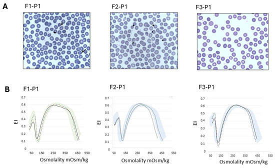 (A) Peripheral blood smear of patients F1-P1, F2-P1 and F3-P1. May–Grunwald–Giemsa staining, 100×. Stomatocytes are indicated with black arrows, and spherocytes and mushrooms cells are indicated with stars and triangles, respectively. (B) Ektacytometric Osmoscan analysis showing normal profile in patients F1-P1 and F3-P1, and reduced area (AUC) and slightly increased Omin in patient F2-P2 with concomitant hereditary spherocytosis. Dashed curve represents the patient; solid curve represents the control of the day; colored areas represent the area covered by normal controls. F1-P1: Family 1, Patient 1; F2-P1: Family 2, Patient 1; F3-P1: Family 3, Patient 1.