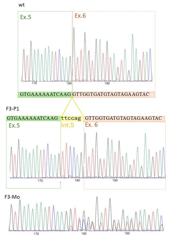 Sanger sequencing of the RT-PCR encompassing exons 5–8 of the ATP-11C transcript in Family 3. The sequence shows the insertion of a fragment of 6bp corresponding to the terminal portion of intron 5 in the proband (F3-P1).